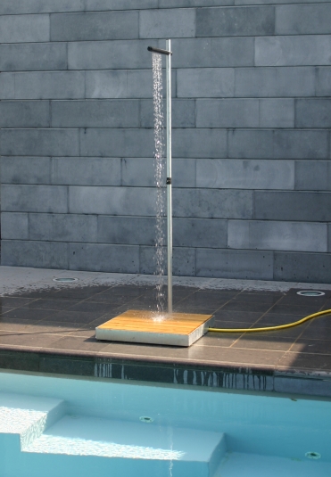 Cascade es una ducha al aire libre para terrazas y jardines hechos de acero galvanizado en caliente. Los tablones de madera de acacia de base es cómodo y agradable para los pies descalzos.